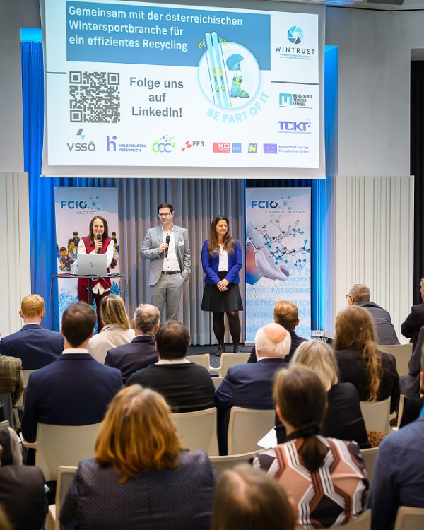 Den Auftakt machten Michaela Plank und David Zidar vom Projekt WINTRUST, das sich der Wiederverwertung von Wintersportartikeln widmet. Skier, Skischuhe und Bindungen sollen künftig nicht mehr im Abfall landen, sondern in einem Kreislaufsystem bleiben. Doch die Realität ist komplex: Bindung und Ski müssen getrennt, der Ski anschließend händisch delaminiert, zerkleinert und in Holz-, Kunststoff- und Composite-Fraktionen sortiert werden. Das Verfahren ist aufwendig – und Rezyklate sind teurer als Neuware. Der Konsument von Wintersportartikeln sei aber bereit höhere Preise zu zahlen.